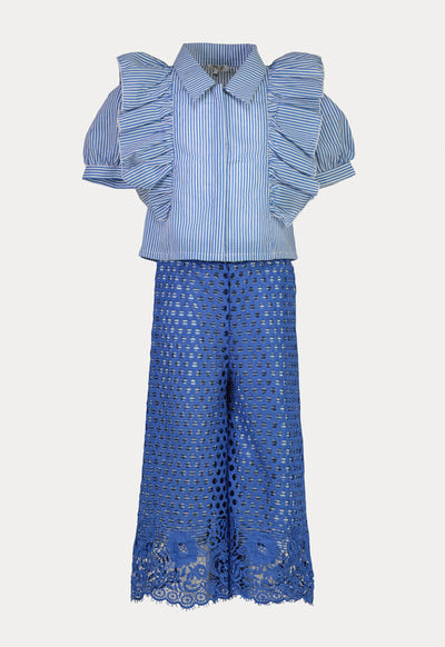 Ruffle Stripes Lace Floral Puff Blouse And Pants Set