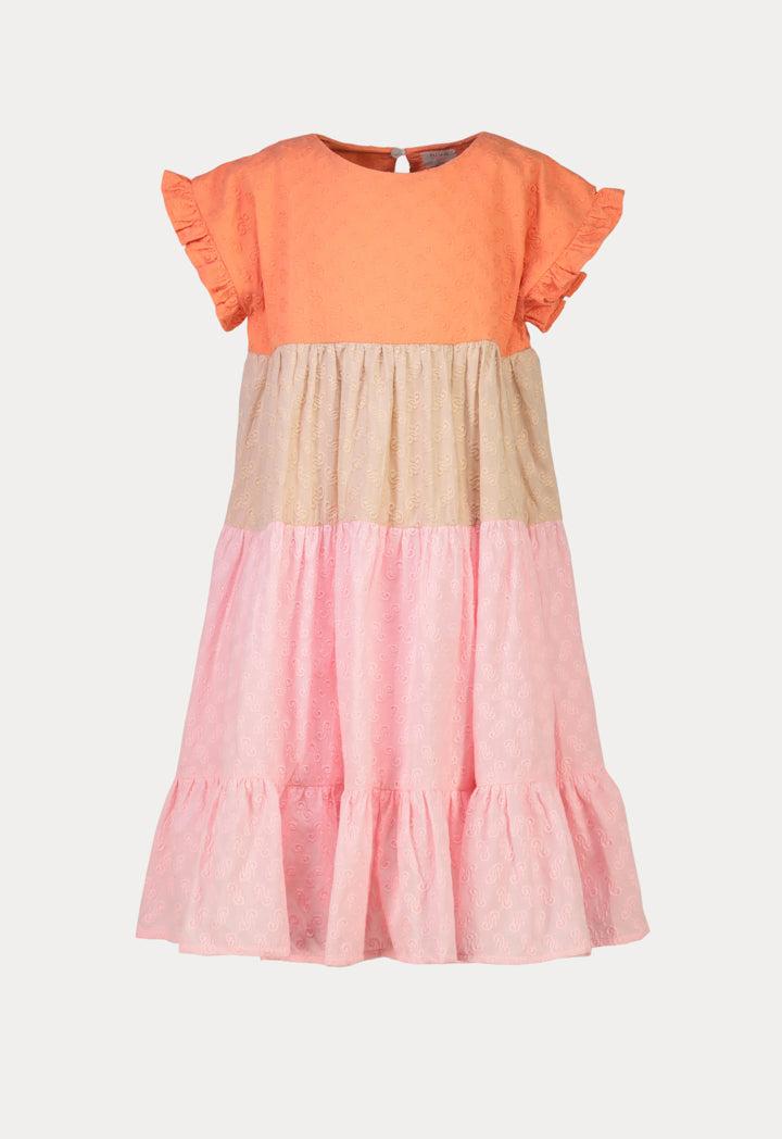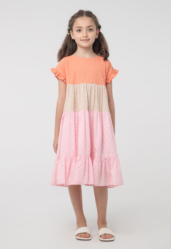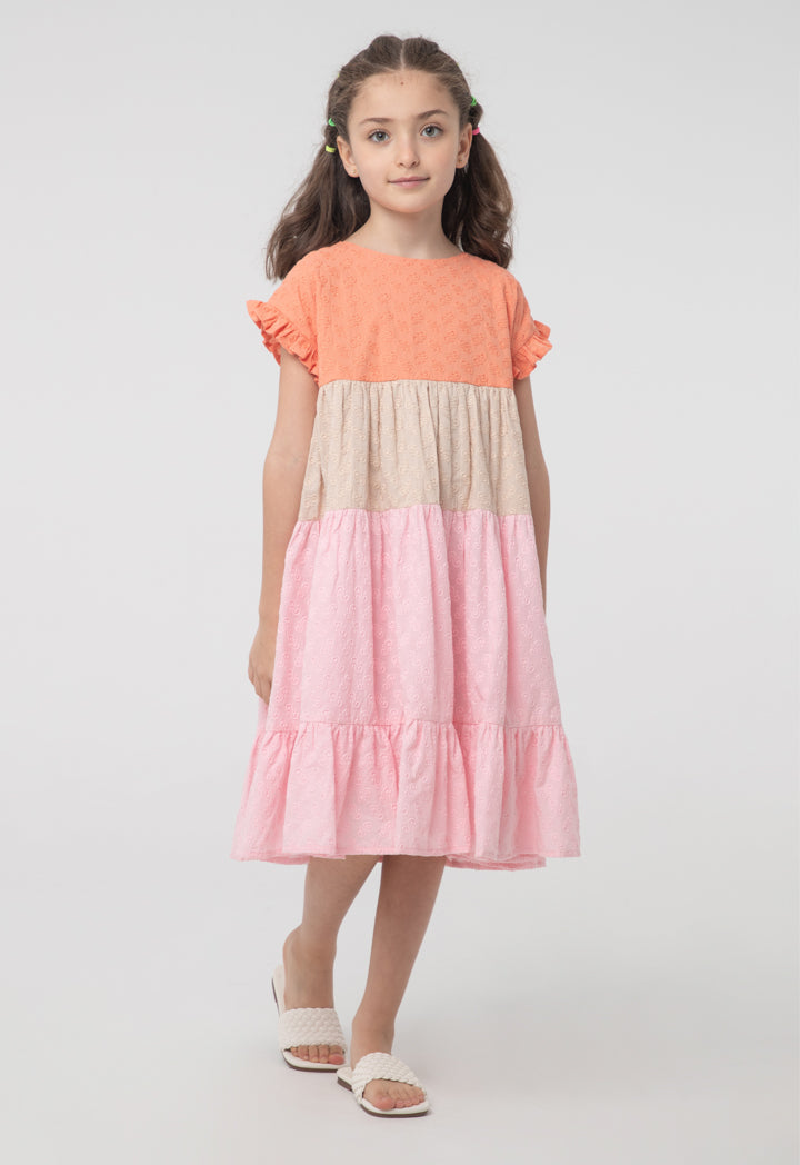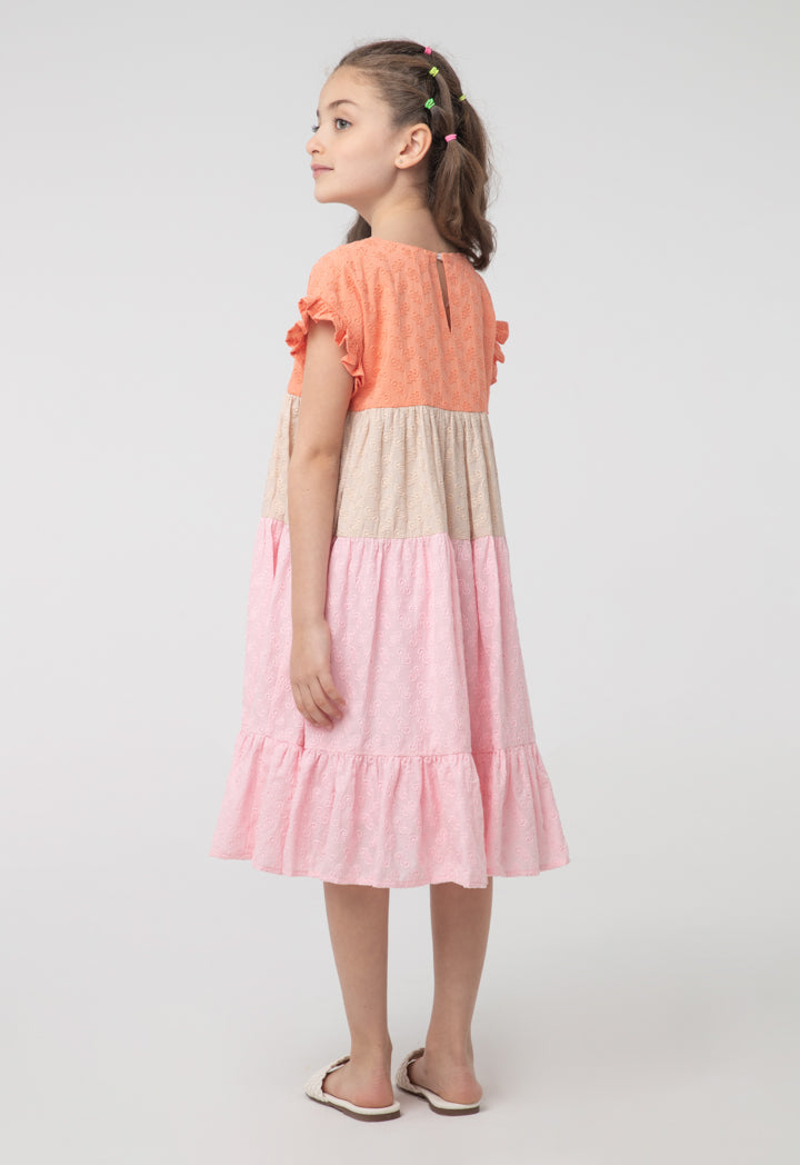 It Has A Crew Neckline With A Sleeveless Frill Trimmed Details. Color Blocking, Comes With A Three Tiered Dress. Fully Embroidered. Has A Single Buttoned Keyhole At The Back.