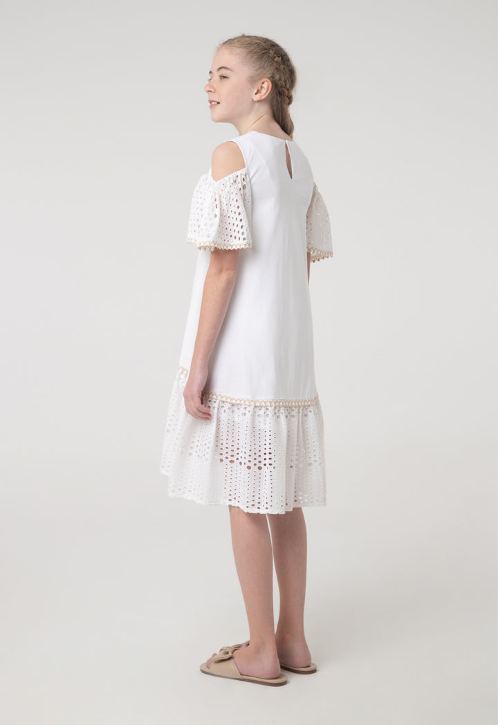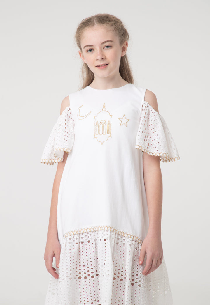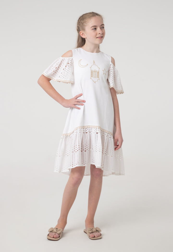 This Style Of Dress Is Designed With A Cut Out Cold Shoulder Sleeves Dress. It Has Flounce Elasticated Sleeves, Crew Neckline, Back Single Button Keyhole, An Embroidery Of The Traditional Lantern, Star And Moon Of The Ramadan Season. A High And Low Cut Out Hem.