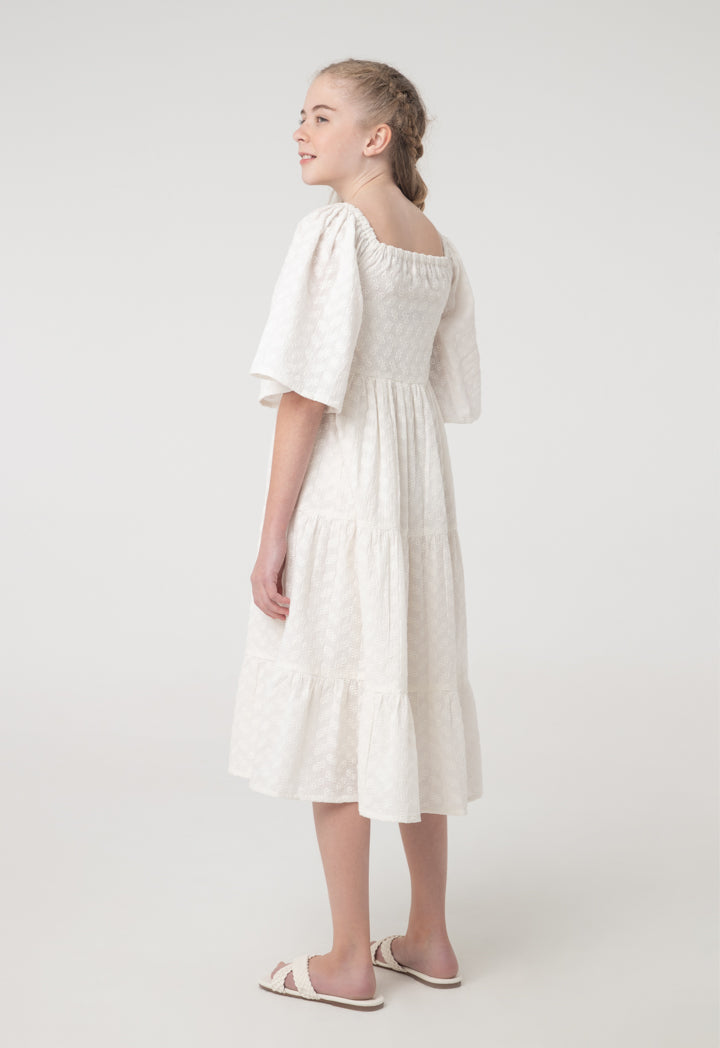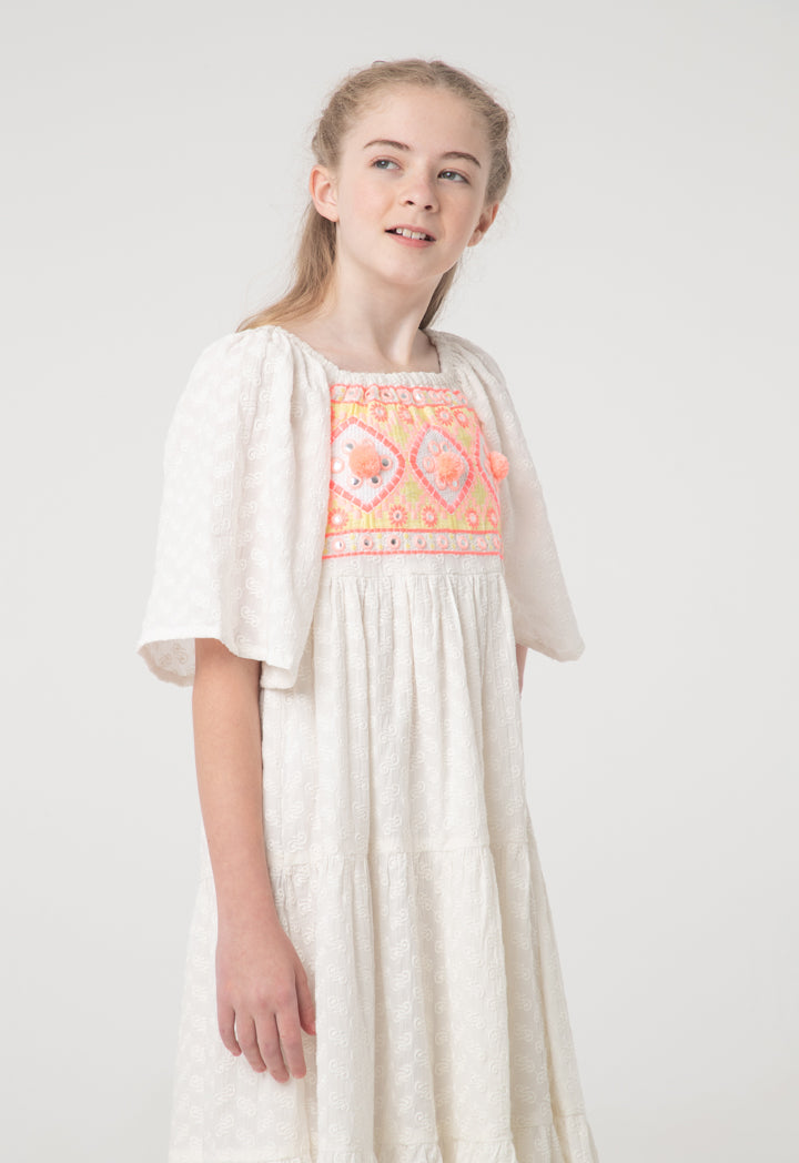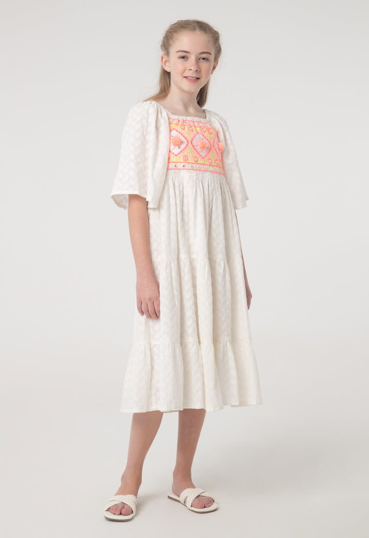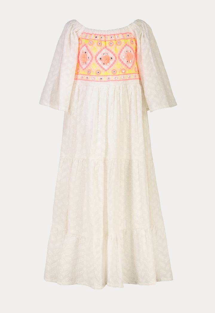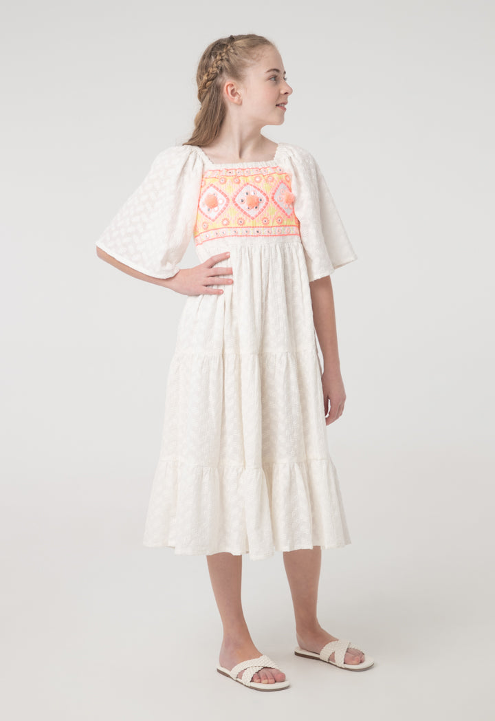 This Dress Is Crafted With A Schiffli Embroidered Bodice With Pompom Details. It Has A Bell Sleeves, Elasticated Neckline, It Can Be Used Either The Traditional Shoulder Strap Or Off The Shoulder, It's A Three Tiered Dress, Ruffle Hem.