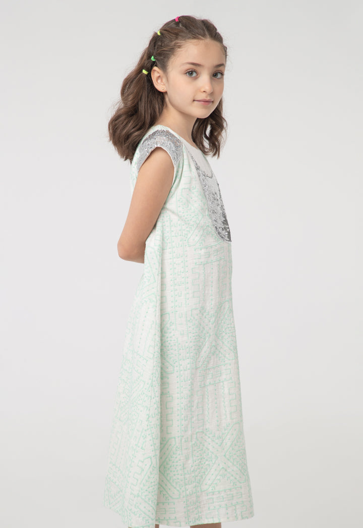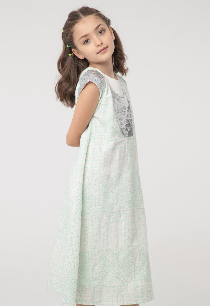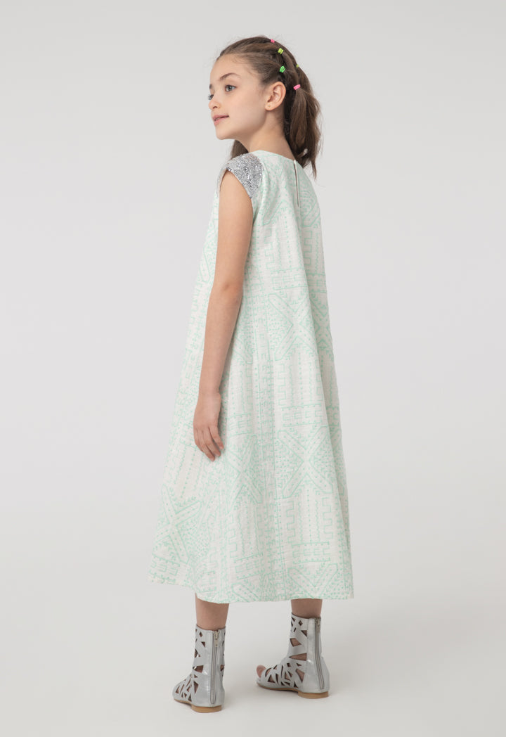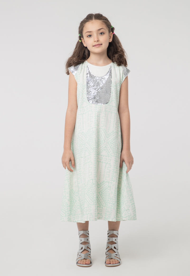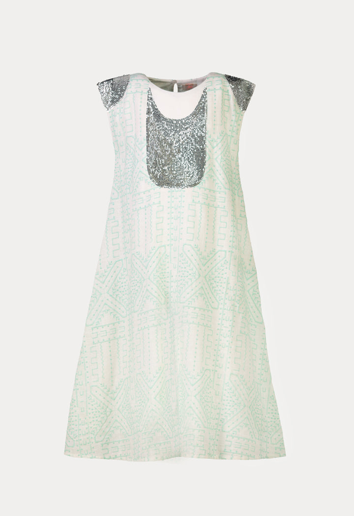 Featuring A Solid Full Geometric Embroidery Dress, That Has A Cap Sequins Sleeves, Bib Designs Sequins Embellishments. A Single Back Button Keyhole And A Flare Hem.