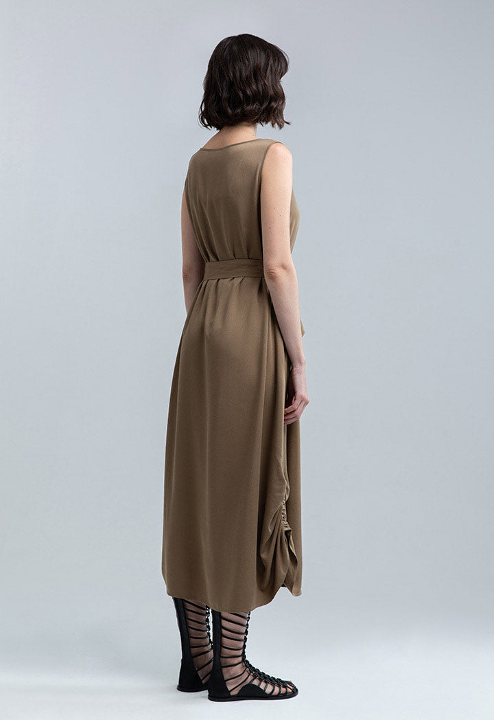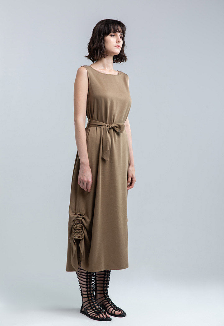 Features: Crew Neck Sleeveless Belt & Loops At Waist Wide Elastic Detail At Side Hem Regular Fold Round Hem