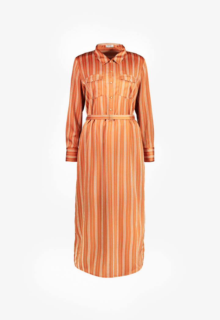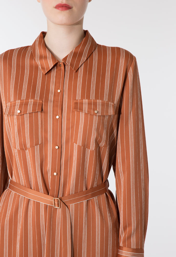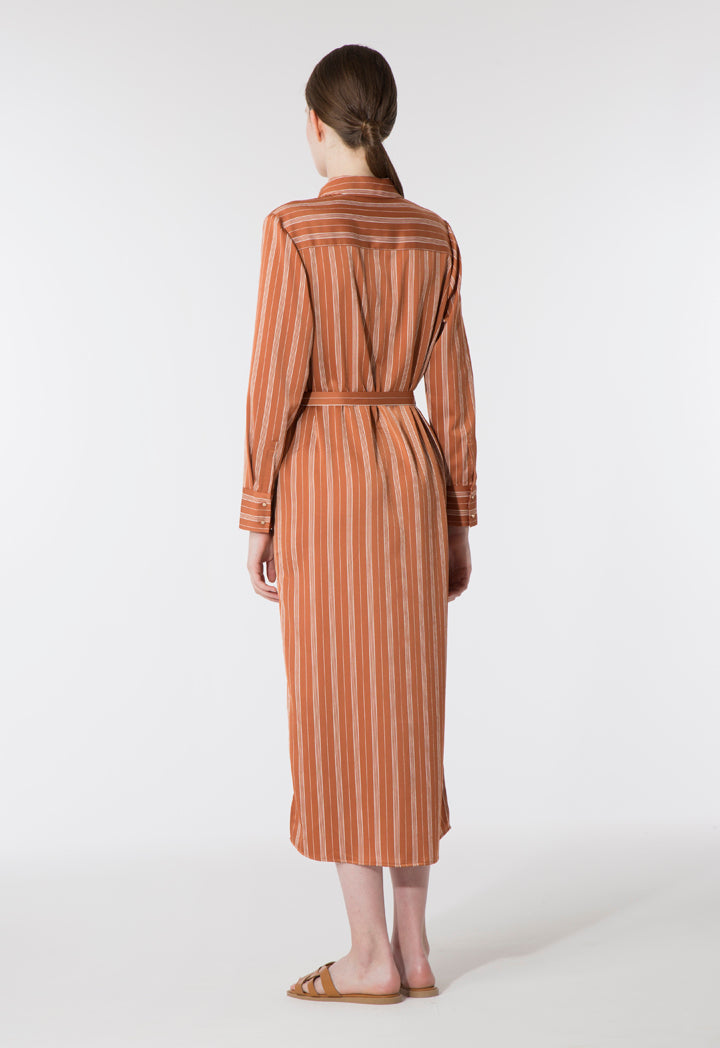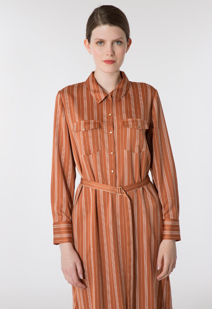 Features: Shirt Dress Collar Neckline Long Sleeves With Buttoned Cuff Front Button Closure Flap Pocket At Front Panel Buckle Belt At Waist Striped Print Slits At Hem Maxi Length