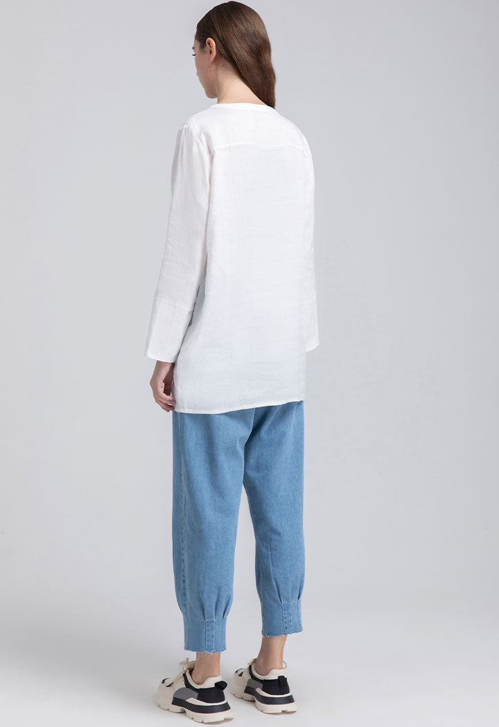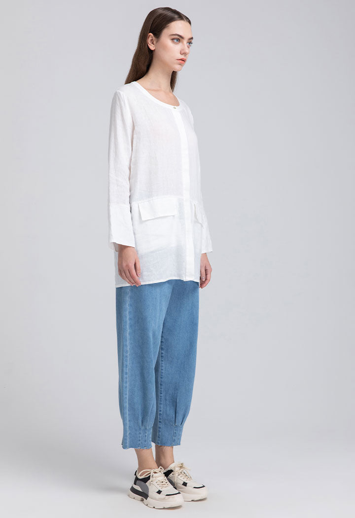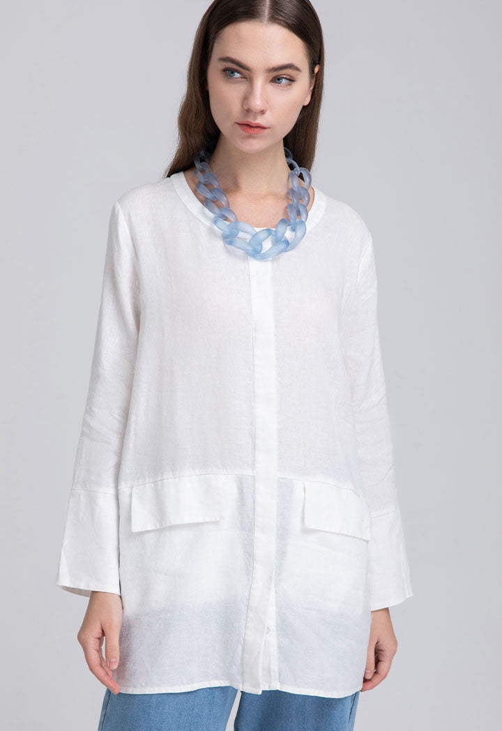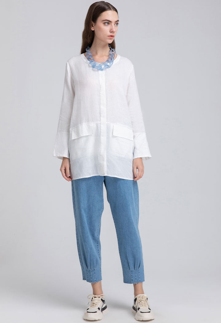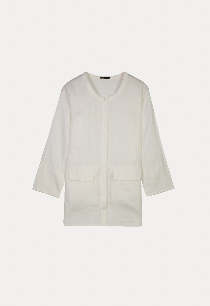 Features: Round Neckline Front Opening Hidden Placket With Buttons Flap Pockets At Front Regular Fit Straight Hem
