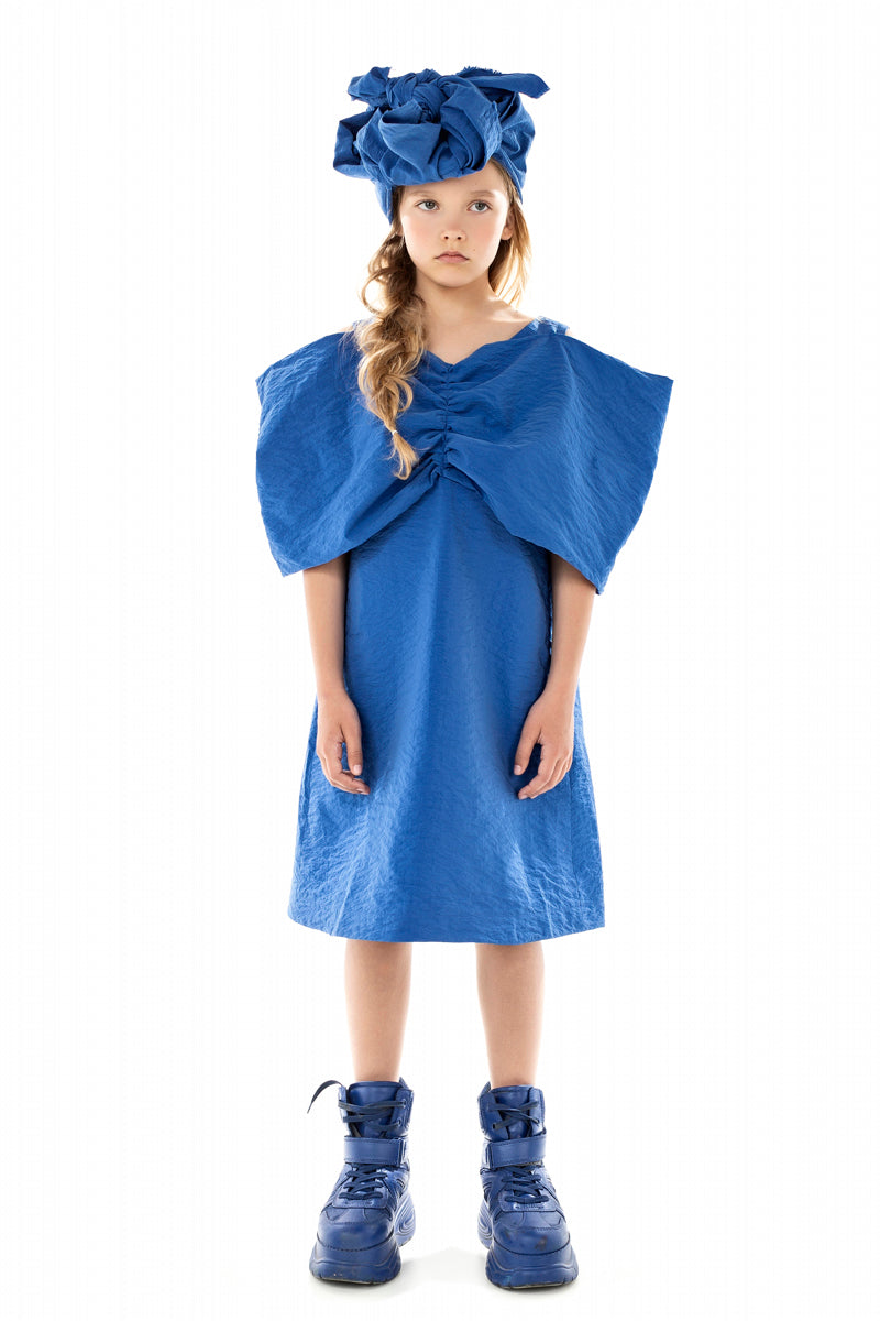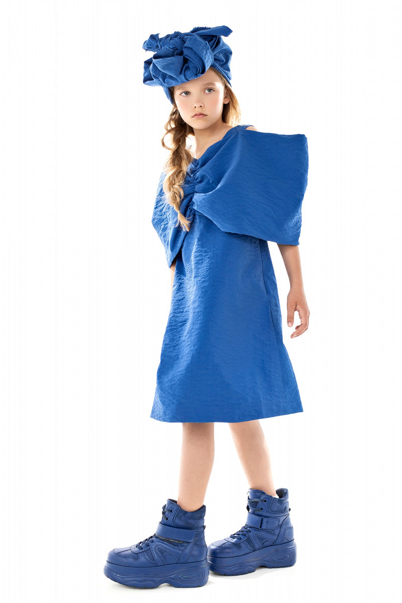 COTTON BLEND QUALITY COLOUR SOLID COBALT OVERSIZED BOW ON FRONT AND BACK A-LINE HEM SHAPE V-NECKLINE BELOW KNEE LENGTH