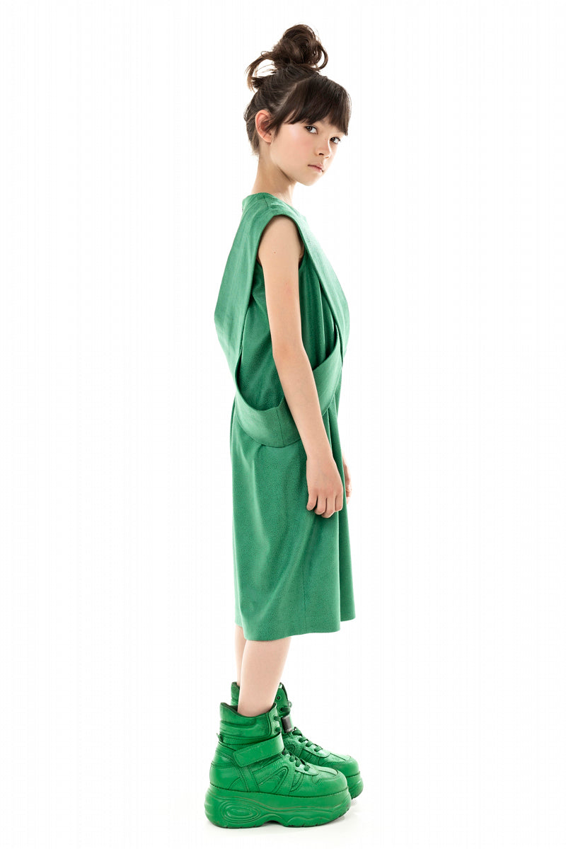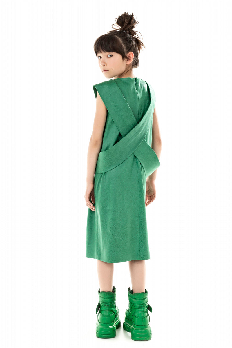 VISCOSE QUALITY SOLID GREEN COLOUR NINJA CROSS BELT ON FRONT AND BACK A-LINE HEM WITH NO SLEEVES BELOW KNEE LENGTH ROUND NECKLINE CONCEALED ZIPPER AT BACK