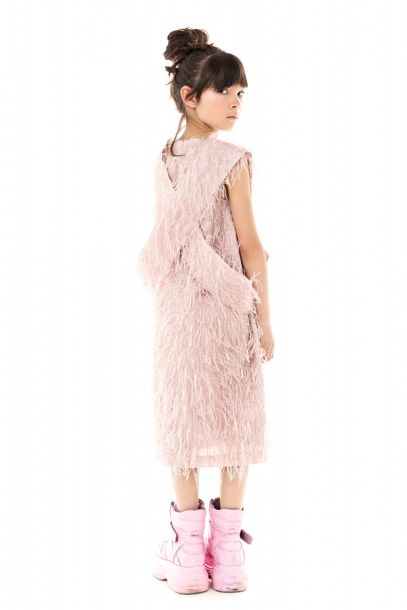 POLYESTER TASSEL FINISH FABRIC QUALITY SOLID PINK COLOUR NINJA CROSS BELT ON FRONT AND BACK A-LINE HEM WITH NO SLEEVES BELOW KNEE LENGTH ROUND NECKLINE CONCEALED ZIPPER AT BACK