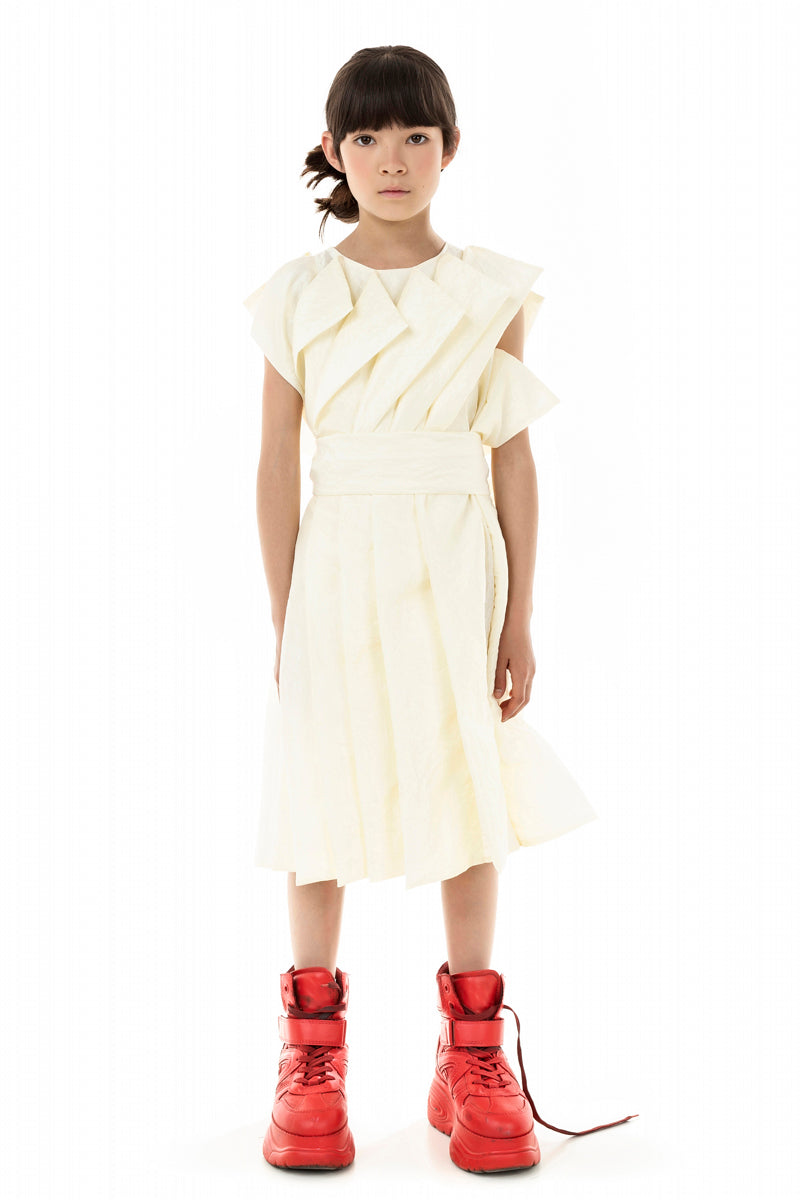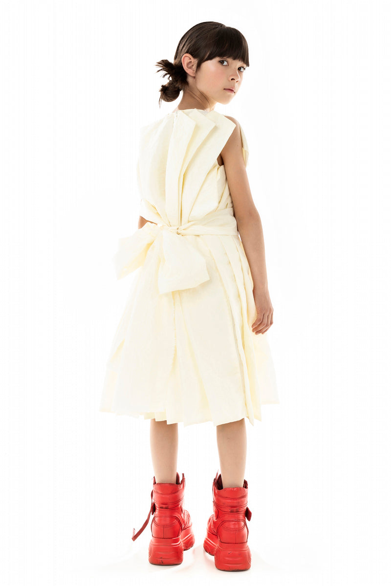 CREAM SOLID COLOUR FULL LENGTH KNIFE PLEATS AT FRONT AND BACK BODY ROUND NECK LINE CONCEALED ZIPPER AT BACK SLEEVELESS STYLE KNEE LENGTH SOLID FABRIC BELT