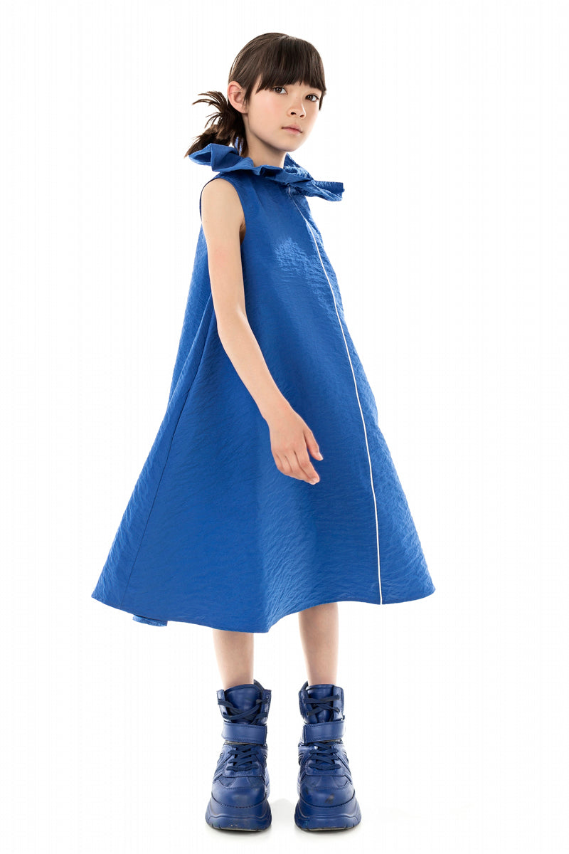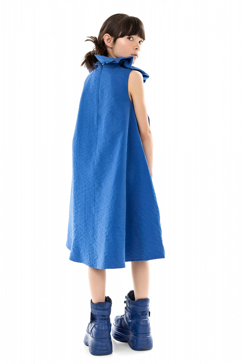 HAMMERED SILK QUALITY SOLID COBALT COLOUR RUFFLE COLLAR A- LINE FLARED HEM SLEEVELESS DRESS CONTRAST PIPING AT FRONT CALF LENGTH CONCEALED ZIPPER AT BACK