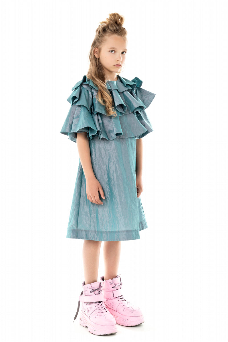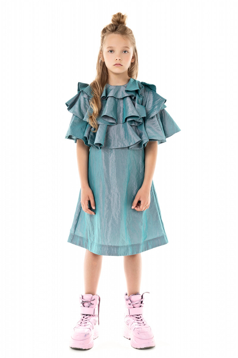 TEXTURED SILK QUALITY SOLID TURQUOISE DRESS MULTILAYER RUFFLES AT YOKE A-LINE KNEE LENGTH DRESS WITH SLEEVES ROUND NECKLINE CONCEALED ZIPPER AT BACK