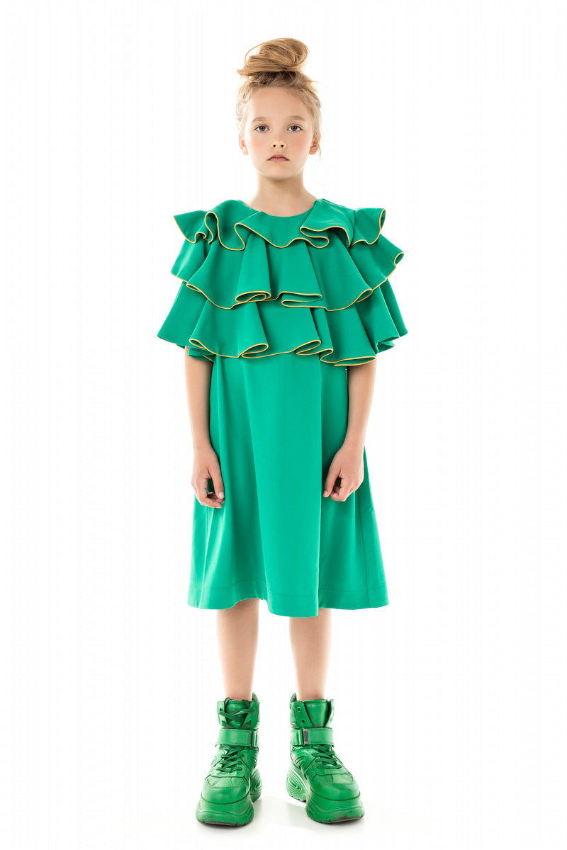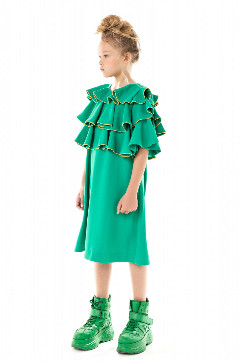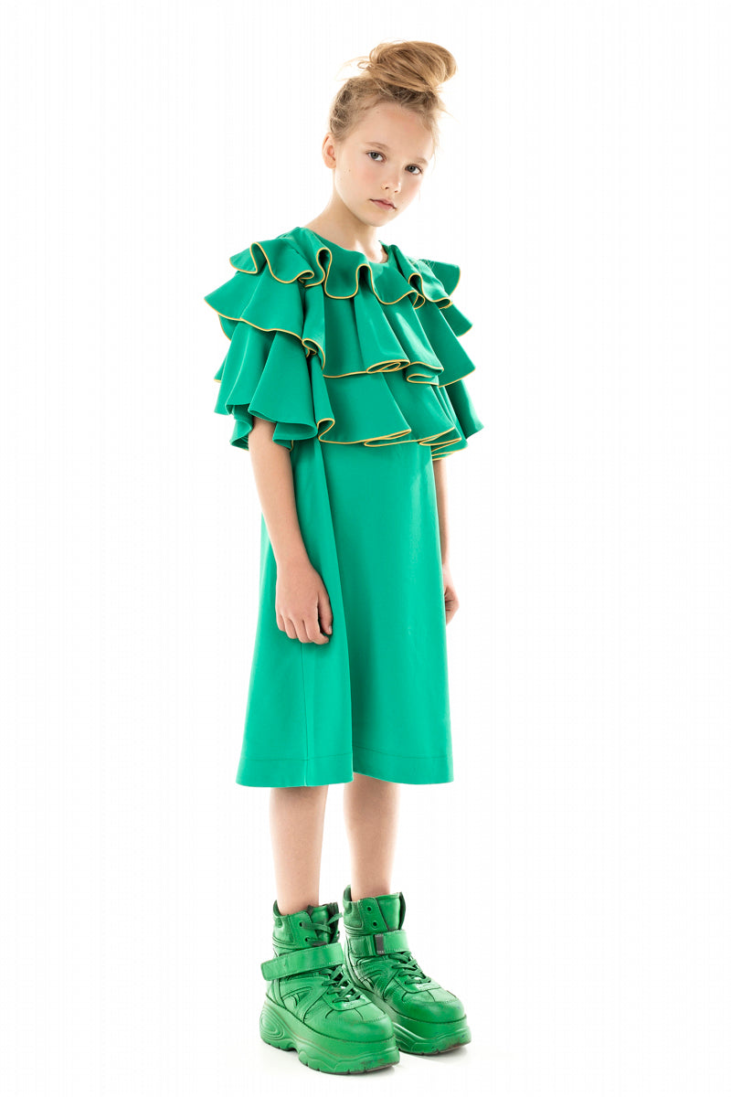 VISCOSE QUALITY SOLID GREEN COLOUR MULTI LAYER RUFFLES AT YOKE RUFFLES WITH CONTRAST PIPING A-LINE KNEE LENGTH DRESS WITH SLEEVES ROUND NECK LINE CONCEALED ZIPPER AT BACK
