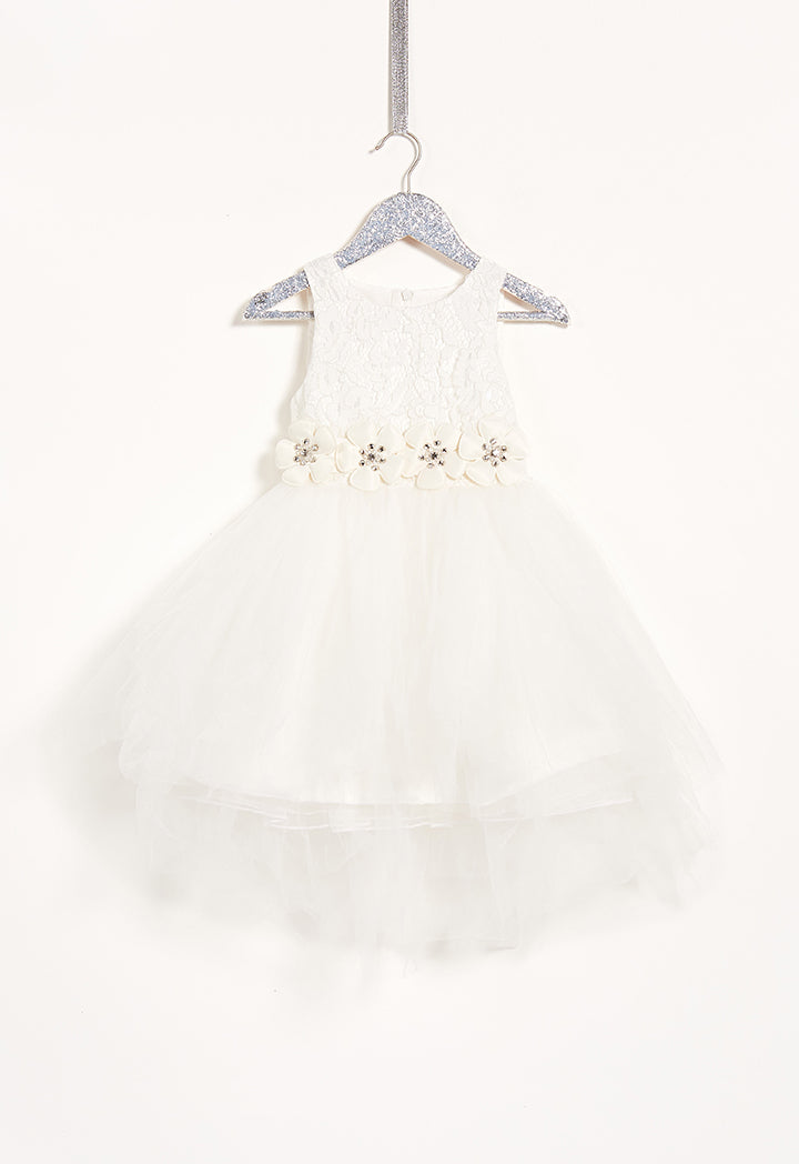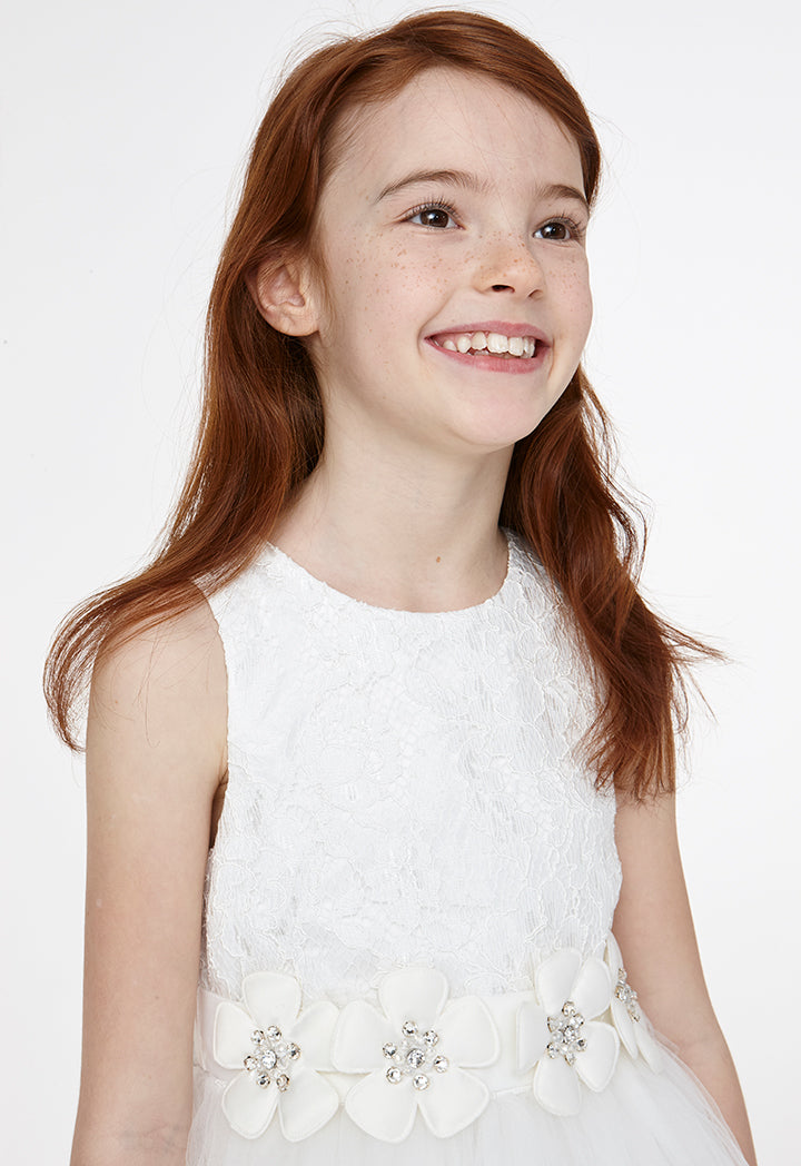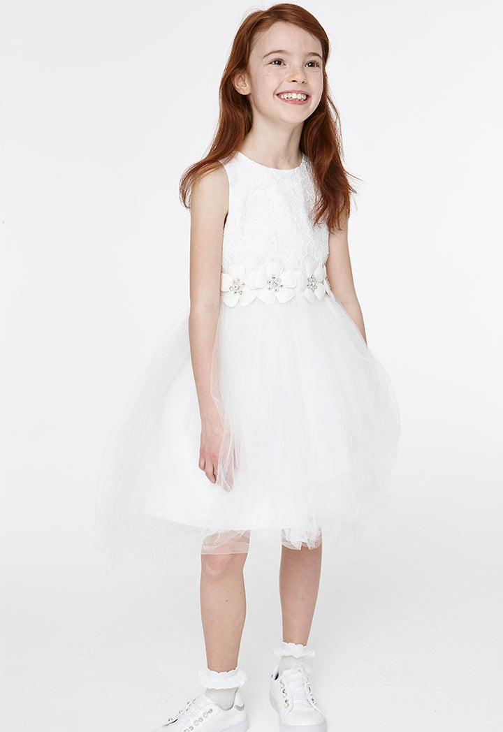 Features: A-Line Dress Round Neck Sleeveless Lace Fabric At Yoke Flower Belt At Waist Net Gathers At Skirt Zipper At Back
