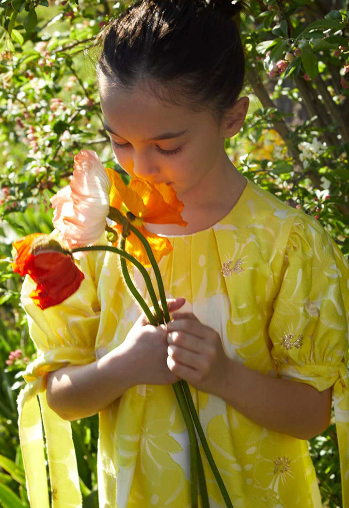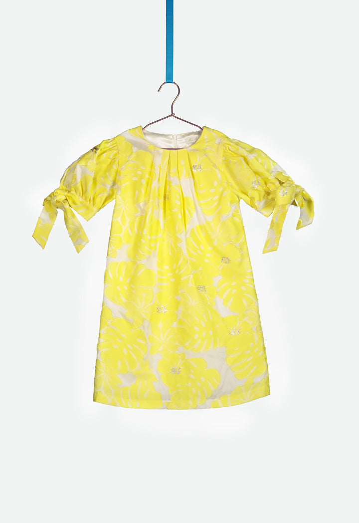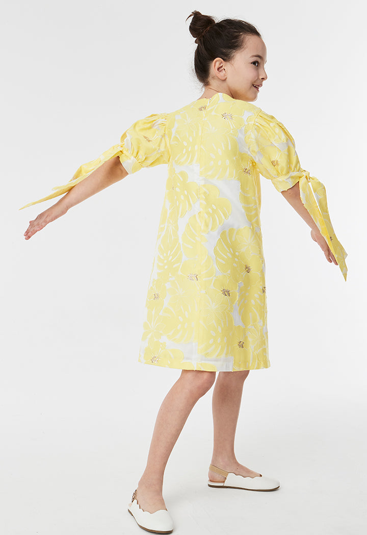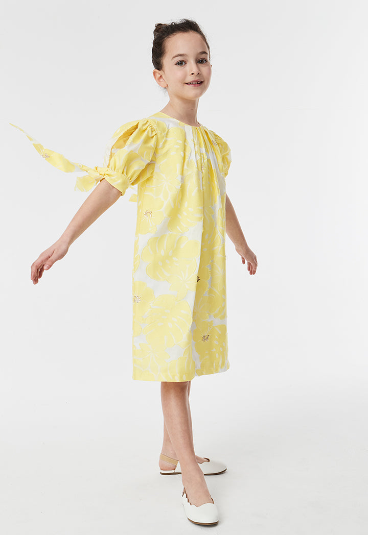 Features: Textured floral dress Round neckline Puff with tie sleeves Regular hem Invisible zipper closure at the back panel