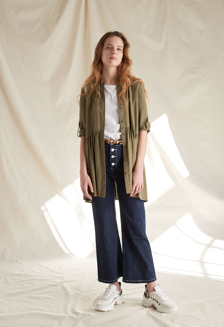 Features: Peplum Dress Mandarin Neckline 3/4 Sleeves Button Closure In Front Panel Mixed Fabric