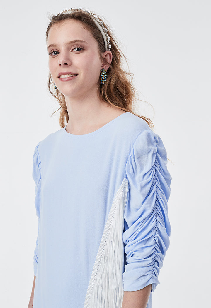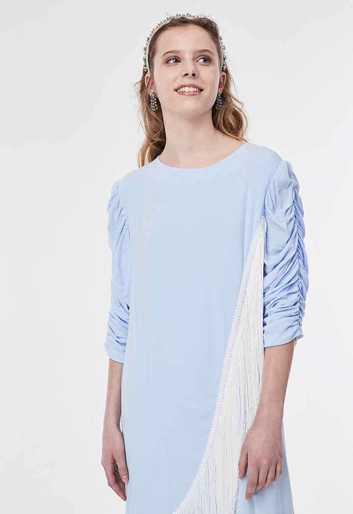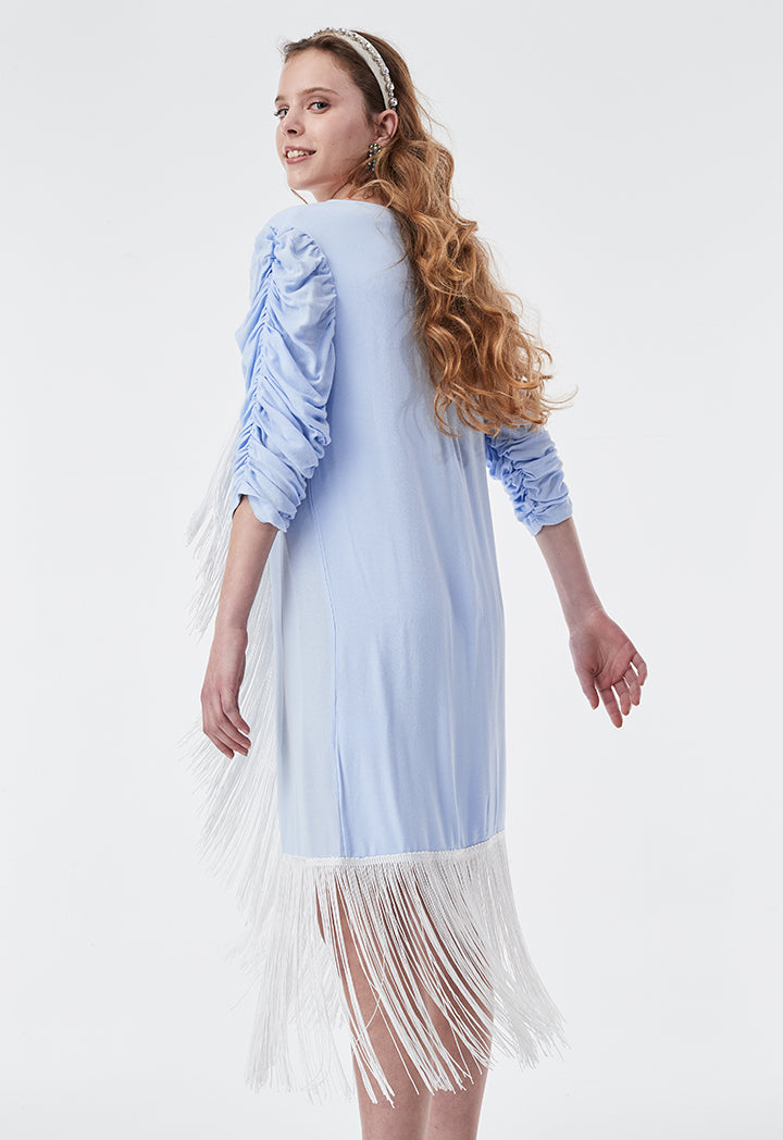 Features: Blue Dress Round Neckline Rouch Sleeve Tassel Trim At Front Panel Invisible Zip Closure At Back Panel Tassel Trim At Hem Straight Cut