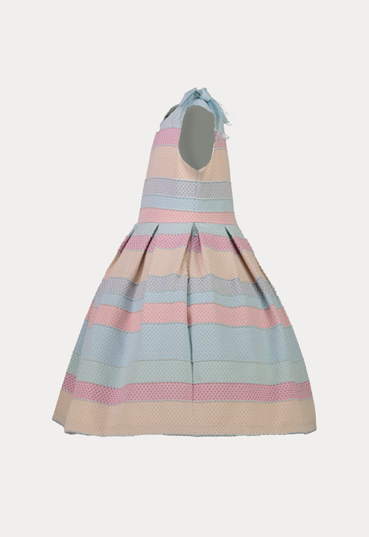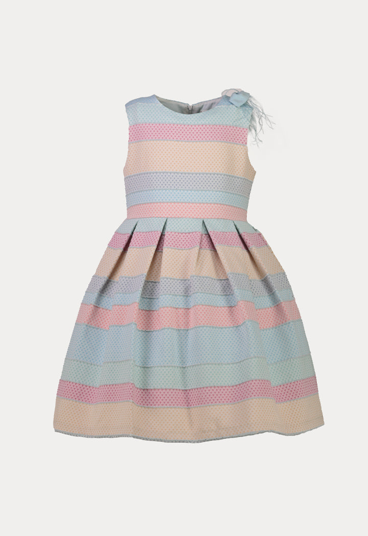 Round Neckline Left Shoulder Bow Box Pleated Waist Horizontal Stripes Color Blocking Zipper Closure At Back