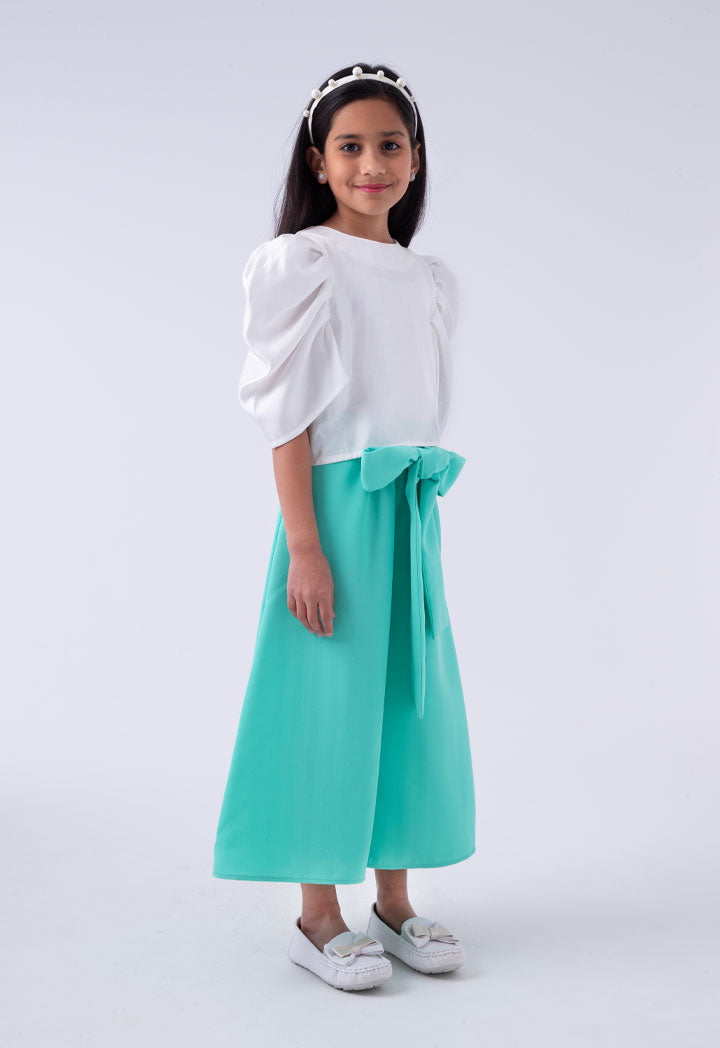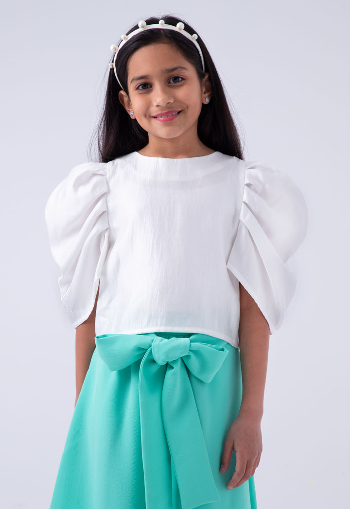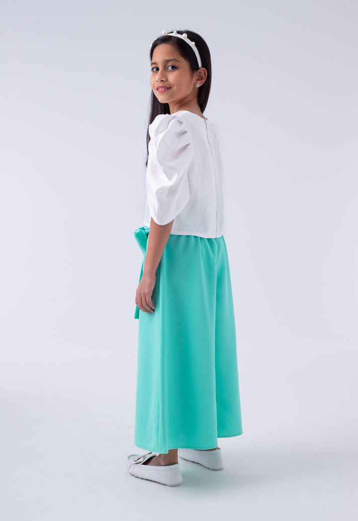 Features: Dress Combo White Pleated Puff Sleeves Top Round Neckline Zipper Closure At Back Pink Culottes Adjustable Waistband With Detachable Self Tie Belt