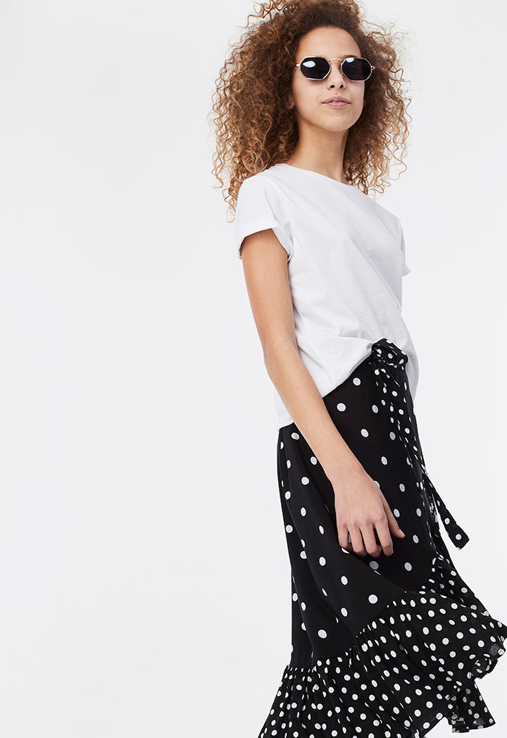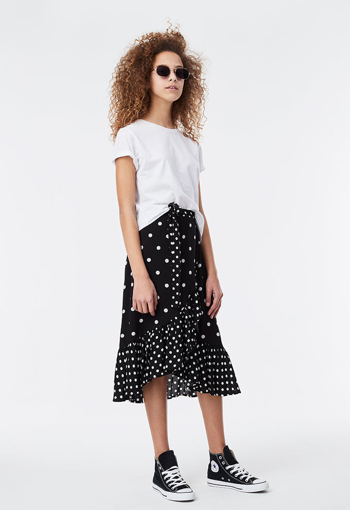 Features: Wrap Frilled Skirt Gathered Waist At Back With Attached Self Tie Belt Polka Dot Pattern Cotton Lining