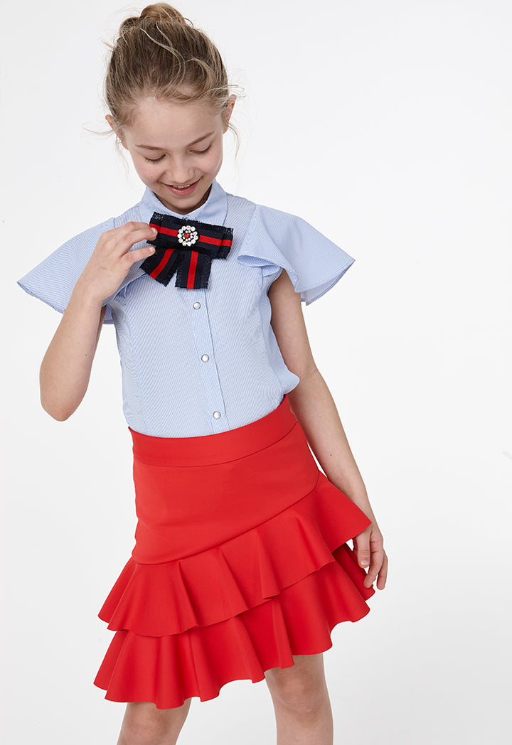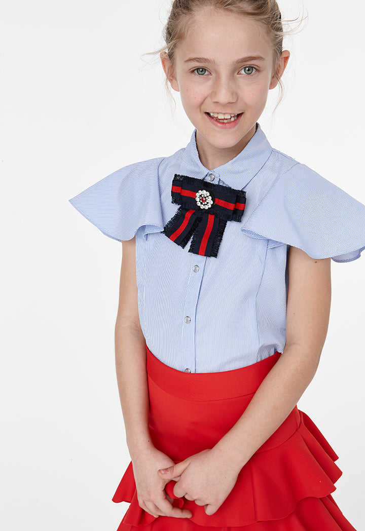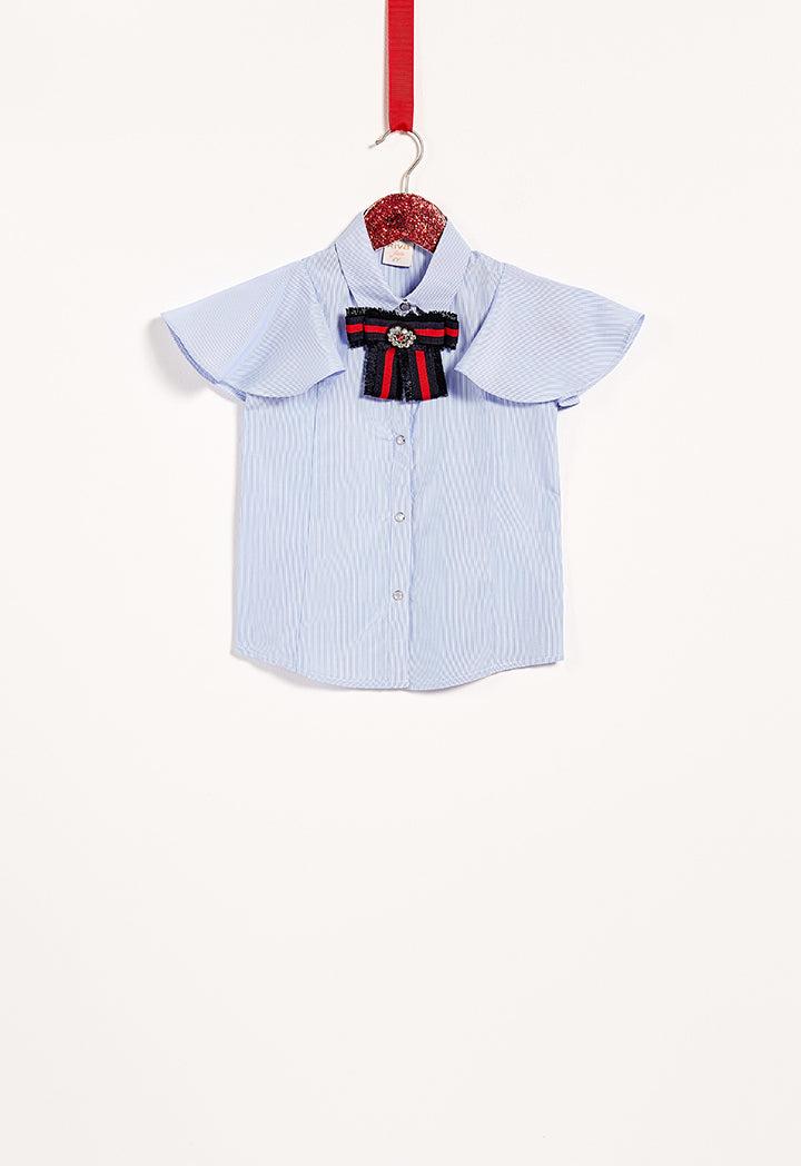 Features: Brooch shirt Shirt Collar Front opening with snap buttons Micro Flared sleeves Brooch detailing at front
