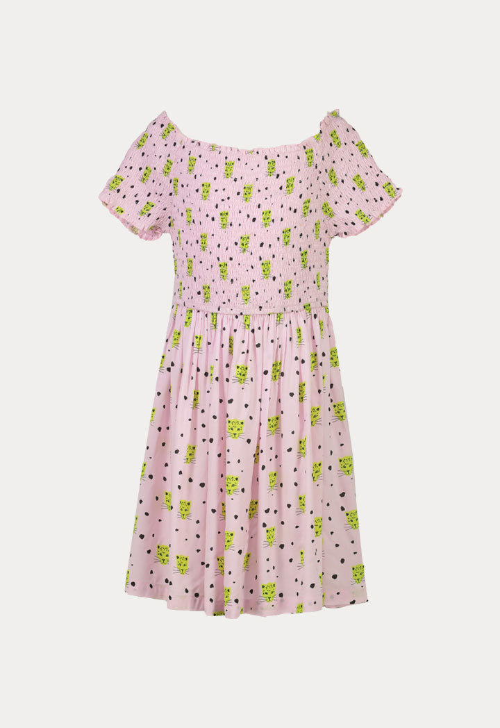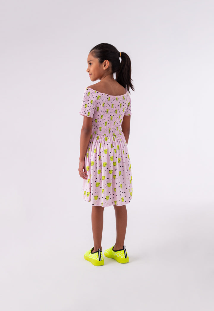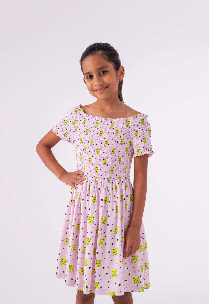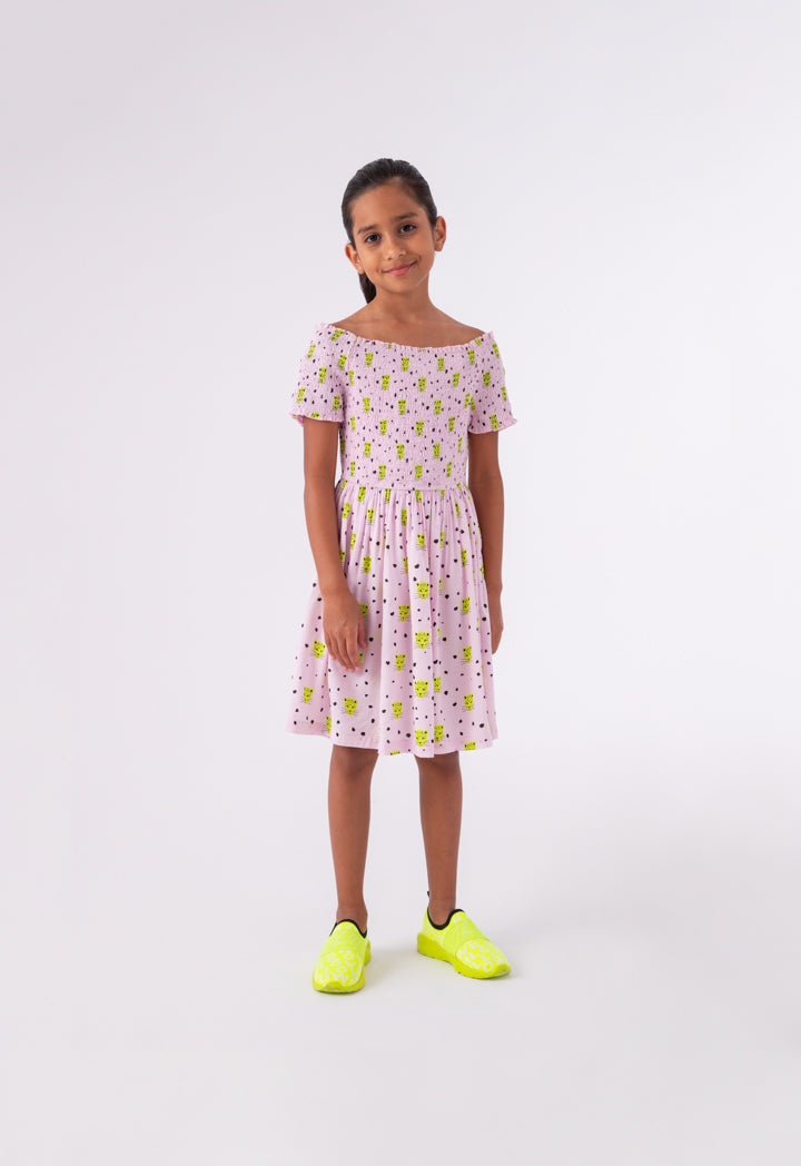 Features: Dress Off Shoulder Short Sleeve Smock Upper Panel Gathered Waist Regular Hem