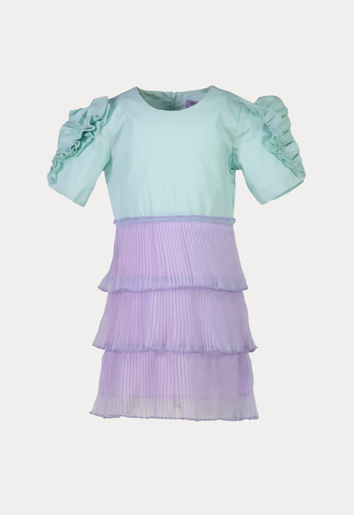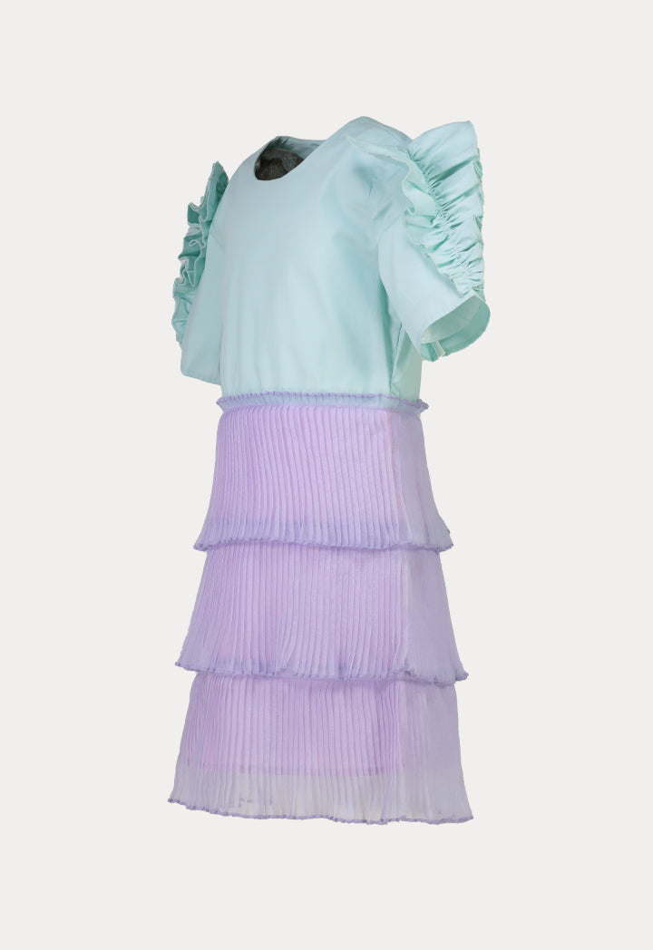 Features: Dress Round Neck Ruffle Short Sleeve Concealed Back Zip Closure Multi Layer Tiered Hem