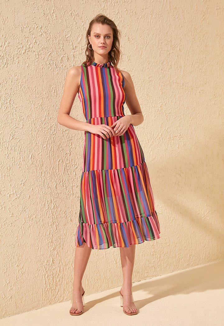 Features: Dress Ruffled Round Neckline Sleeveless Tiered Ruffle Hem Midi Length Concealed Zip At Back Multicolor Striped Pattern