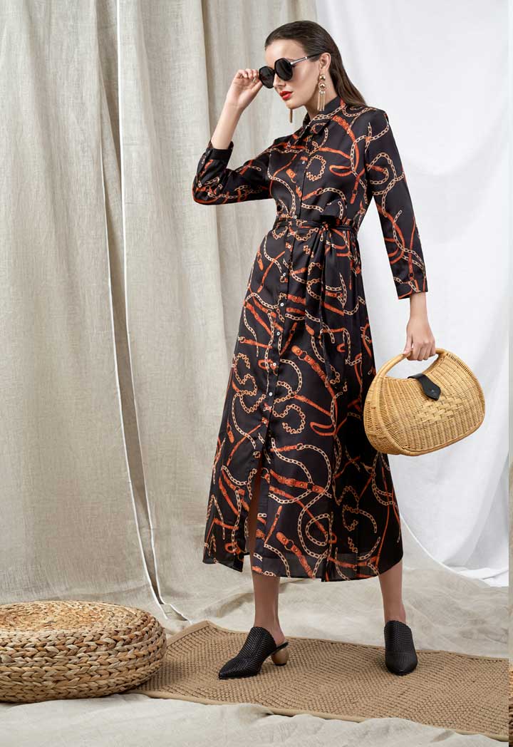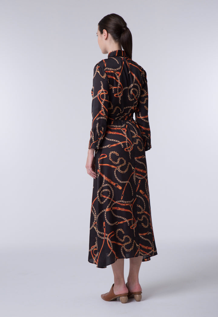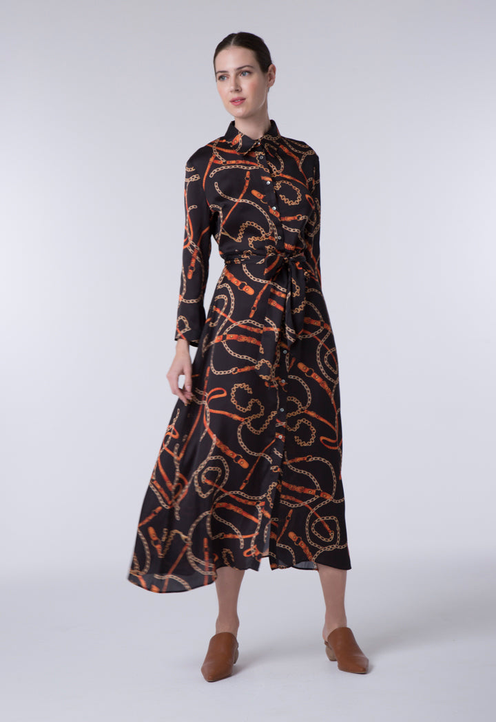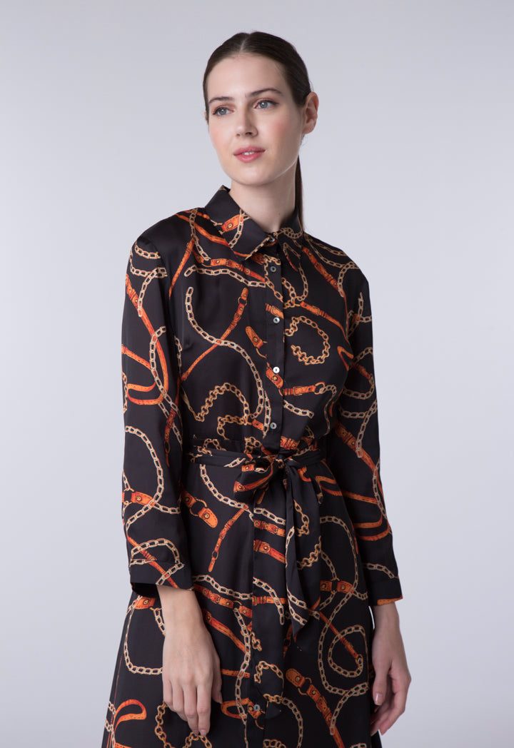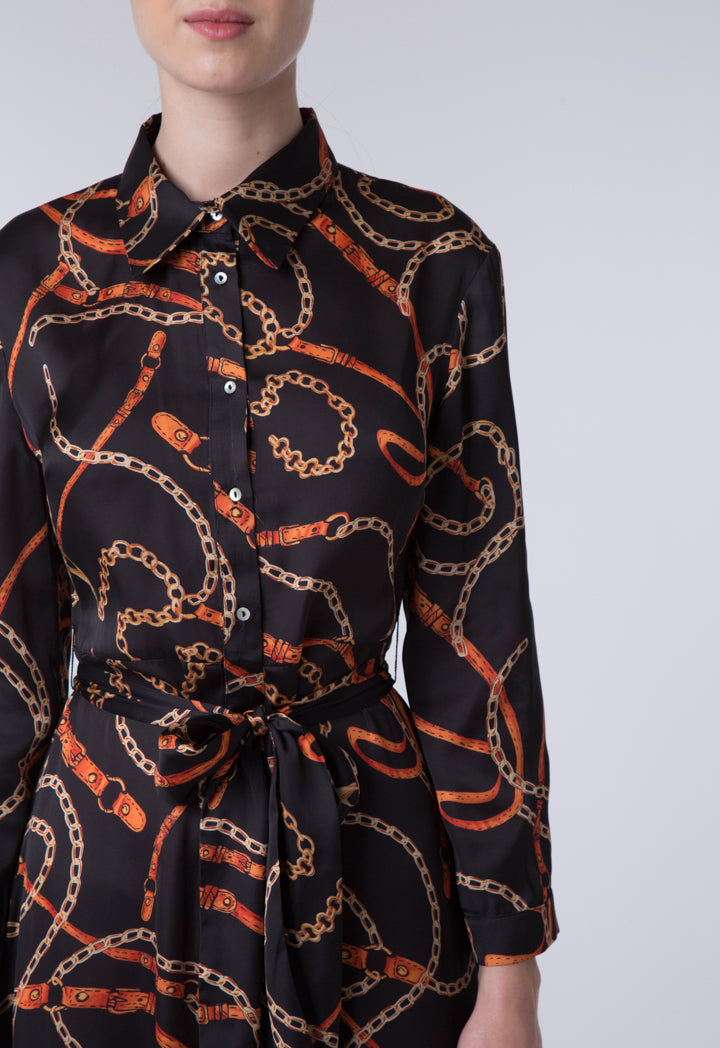 Features: Chain Print Dress Shirt Collar Long Sleeves Button Closure In Front Panel With Self Tie Belt