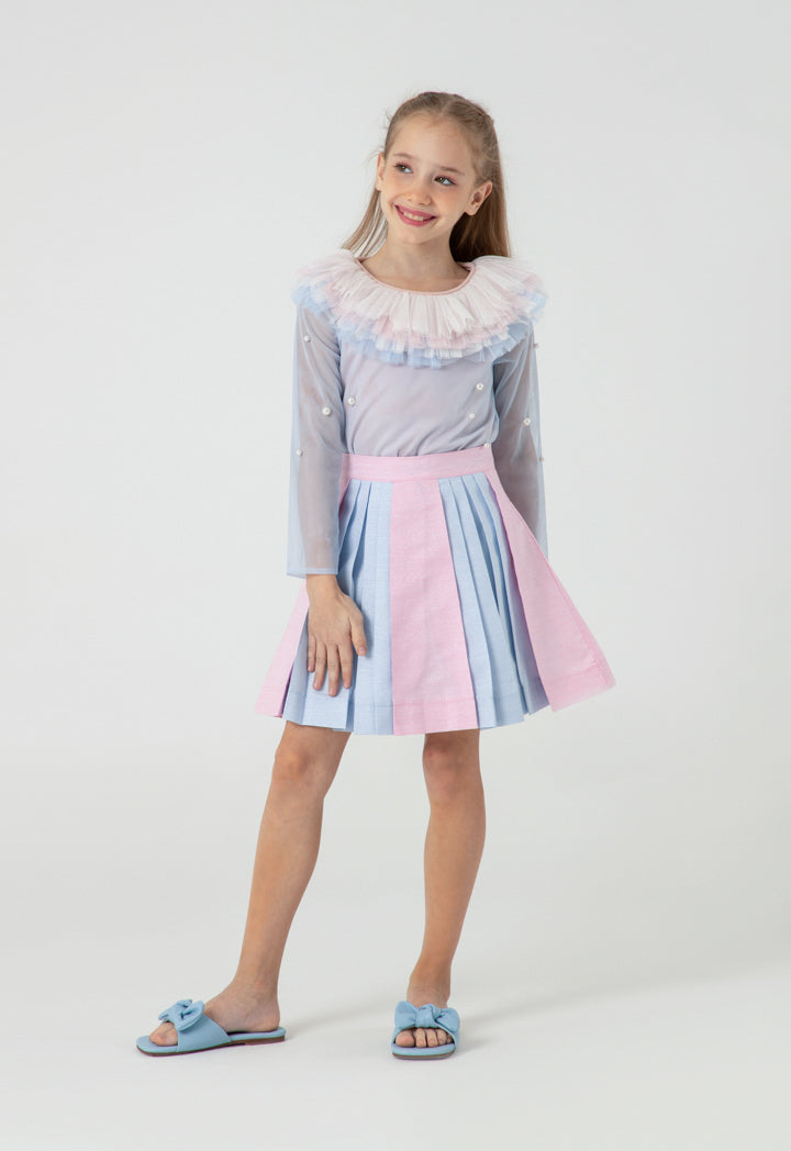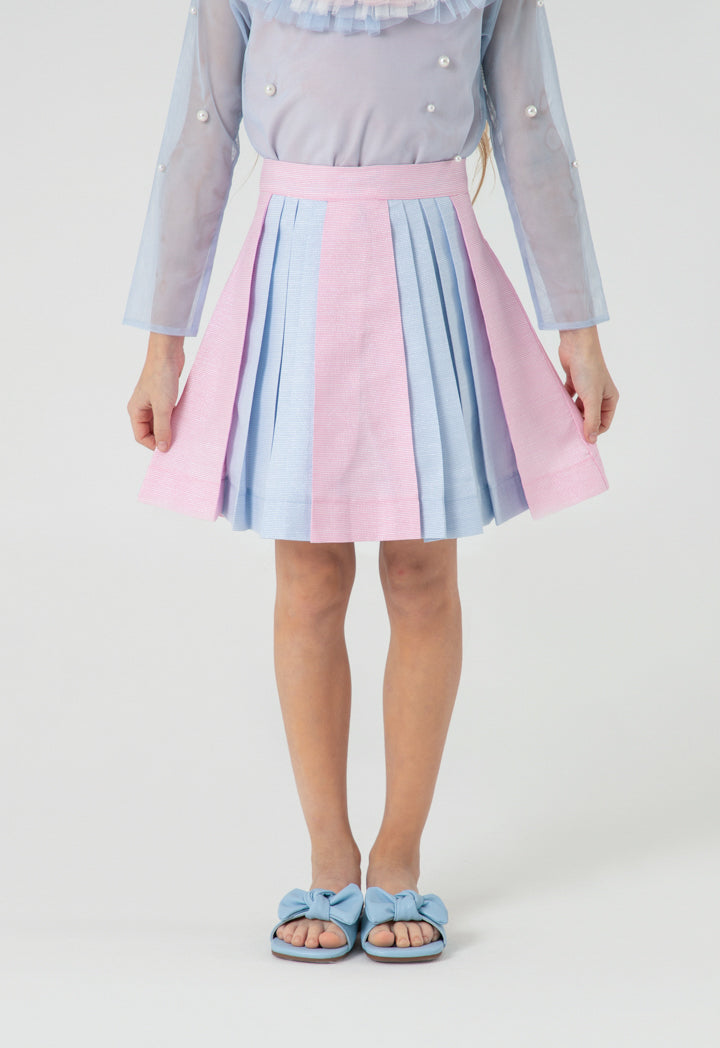 Features: Stripe Lurex Skirt Regular Waistband Colorblock Front Pleated Concealed Center Back Zip Closure Lining With Mesh Ruffle Hem Regular Hem