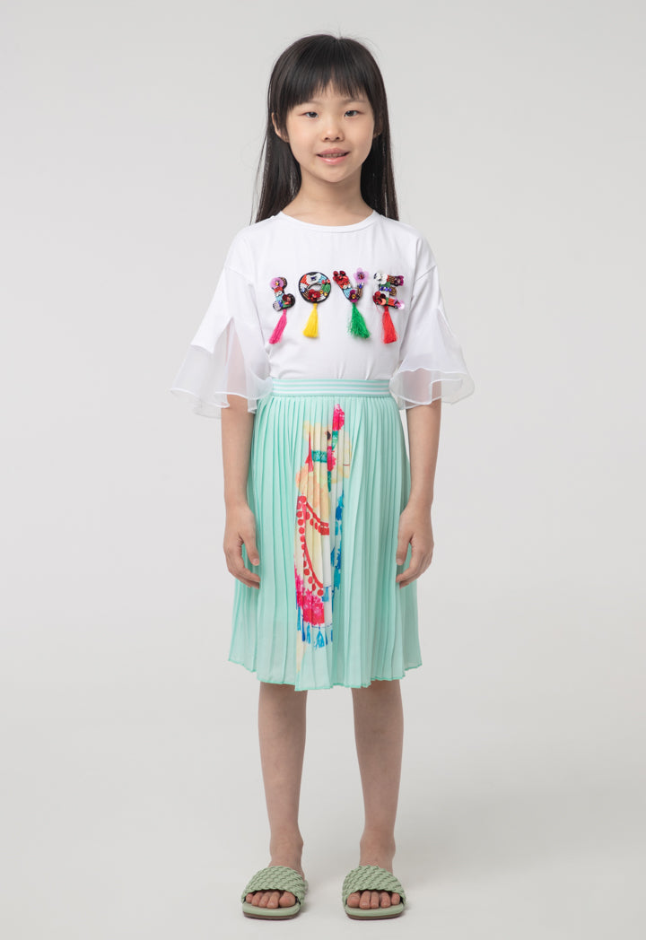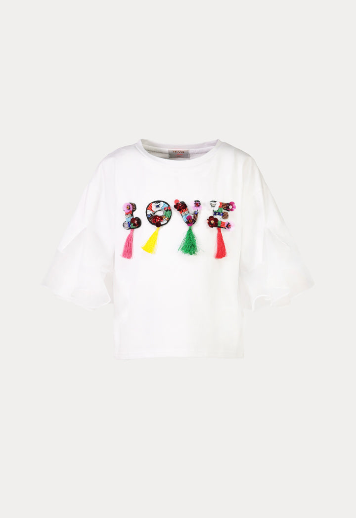 Embellished Text Patched Tassel Flounce Blouse Is Designed With A Tasseled Text With Multi Color Embellishments, Has An Organza Flounce Trim Inserted At The Blouse Sleeves. It Has A Crew Neckline.